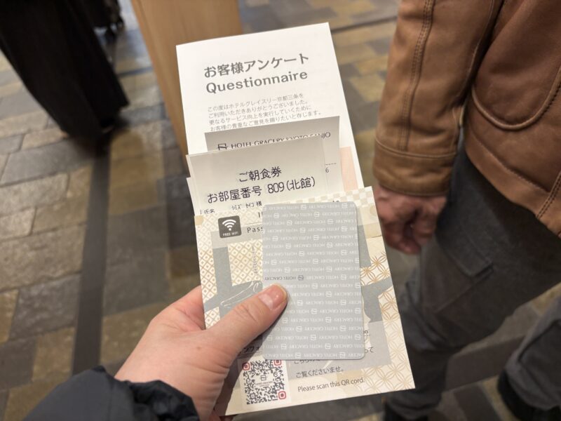 チェックインは対面と自動チェックインあり、私たちは自動チェックイン。名前と住所のチェック、同行者の名前を入力して最後にサインしたらカードキーが2枚、朝食券などが出てきました。スタッフさんから館内の説明を受けて5分ほどでチェックイン完了です。
