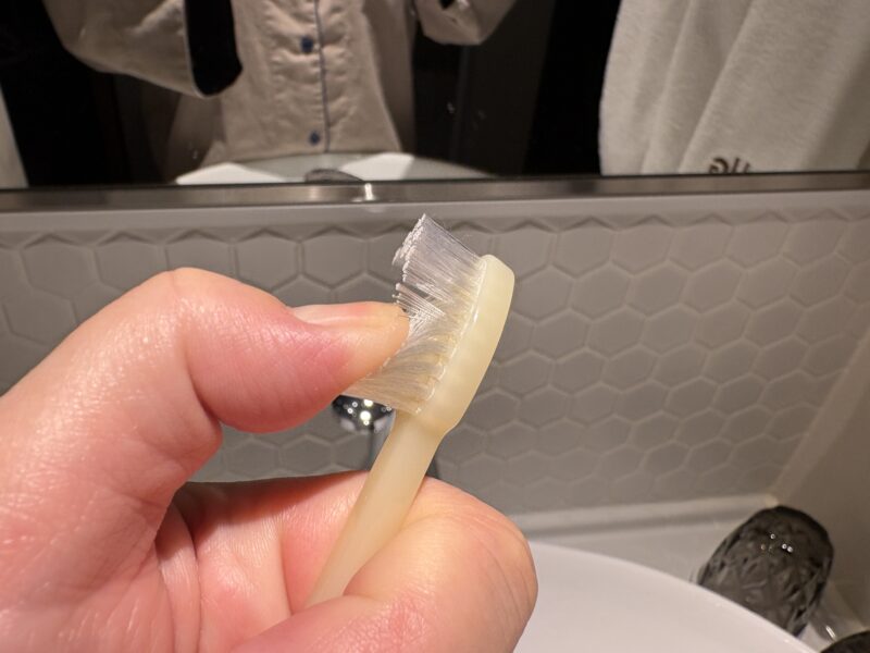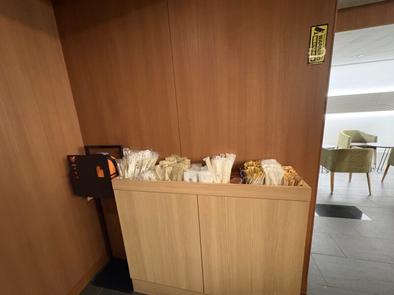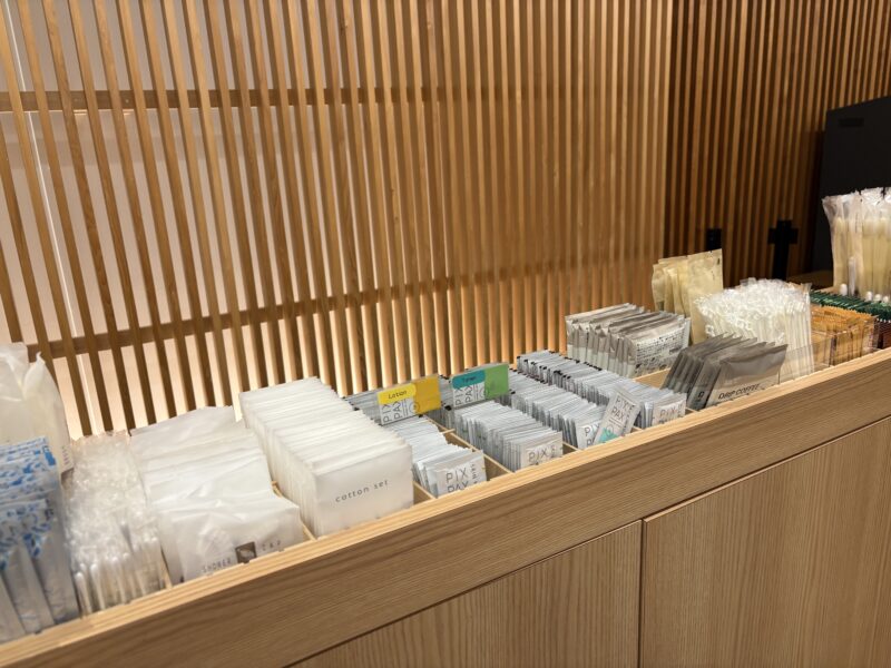 対面のレセプション台とチェックイン機の間にアメニティコーナーがありました。スキンケアセットまで揃う充実の内容。必要なものをピックアップします。