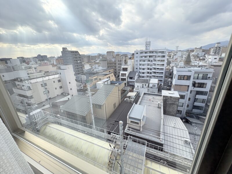 ベッド横には大きな窓があり、高い建物が少ない京都ならではの開放感があります。