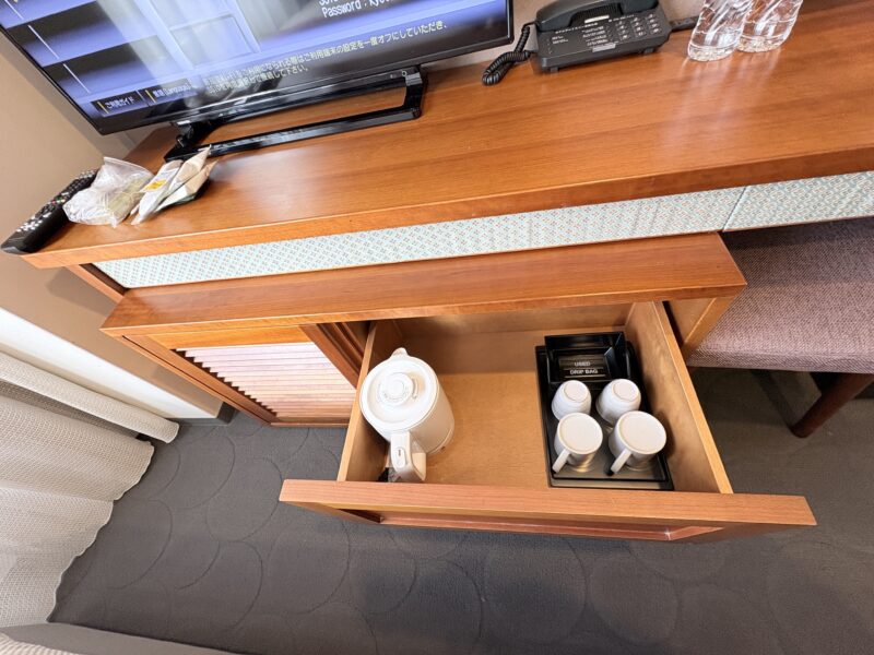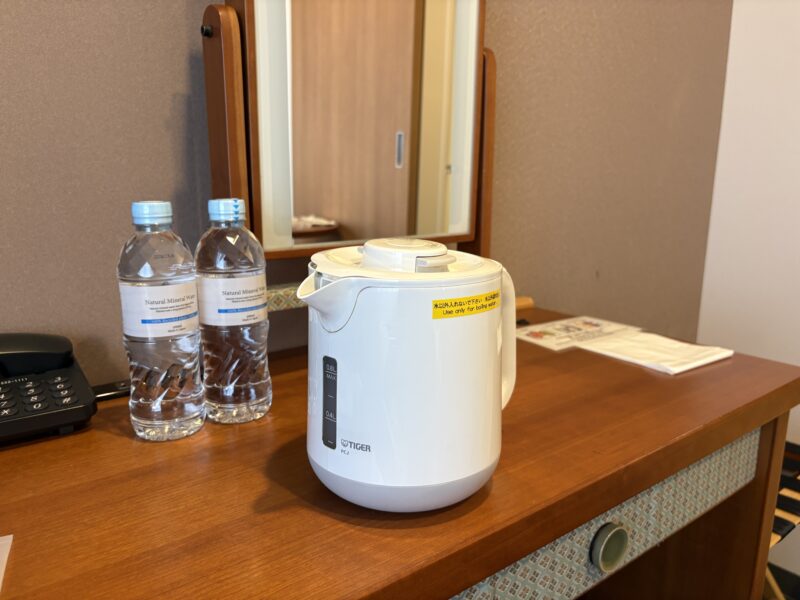 電気ケトルはTIGERのもの。沸くのが早くて快適です。他のホテルですが使って良かったで自宅でも同じシリーズのものを買ったくらいお気に入り。ミネラルウォーターがあったのもありがたいです。
