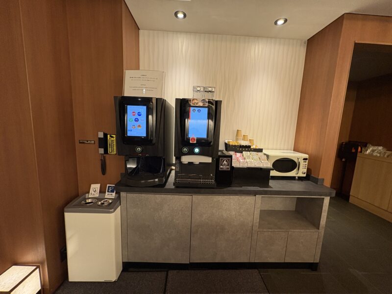 こらではソフトドリンク、コーヒー、紅茶の飲めて、電子レンジ完備。錦市場や商店街で買ってきた京都グルメをイスに座ってゆっくり食べることできます。商店街の中にホテルがあるのでスープも冷めない距離なので便利すぎるカフェとしても利用できます。多くの人が寒空の公園で立ち食いしている中で室内でゆっくり食べられるのはこのホテルの大きな利点。