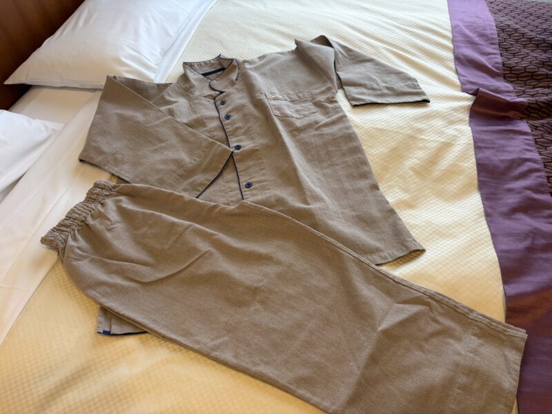 部屋着はセパレートでシャリっとしたハリのある質感で麻が含まれていそうな感じ。