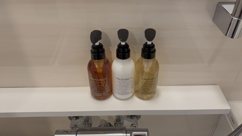 バスアメニティはペリカン石鹸「プロバンシアシリーズ」。シャンプーとコンディショナーはやわらかいラベンダーの香りでツヤ良く仕上がるタイプ。ボディシャンプーはアーモンの甘い香り。どちらも香がよくて癒されます。