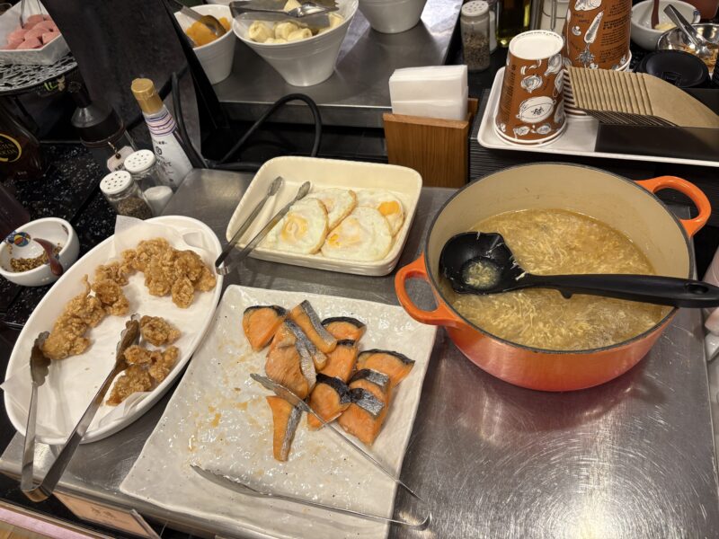 朝食ビュッフェ定番の焼き魚、目玉焼き、唐揚げ。トロごろのかき玉汁もありました。