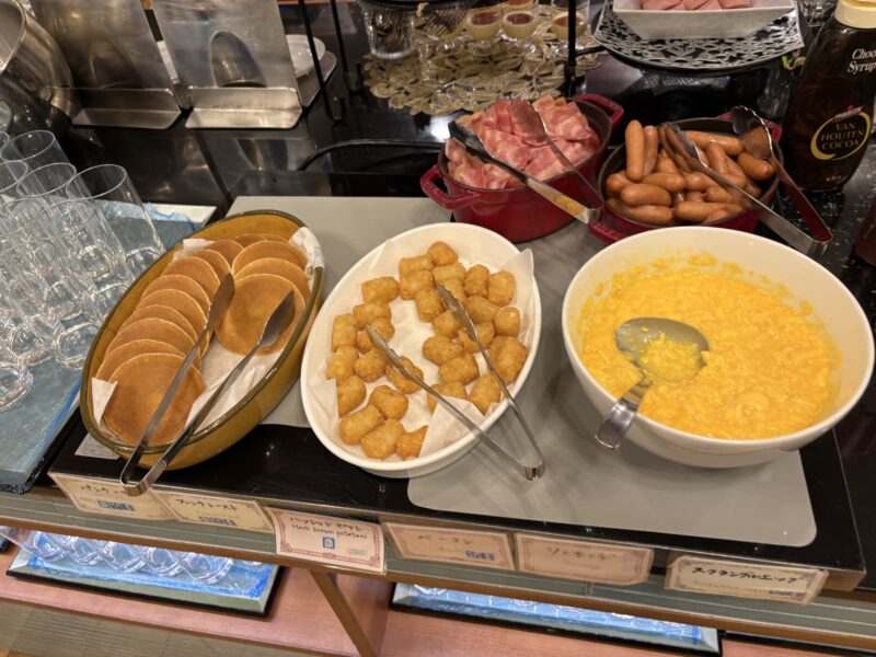 こちらも定番、洋食チーム。スクランブルエッグ、ハッシュドポテト、ウインナーにベーコン、パンケーキ。