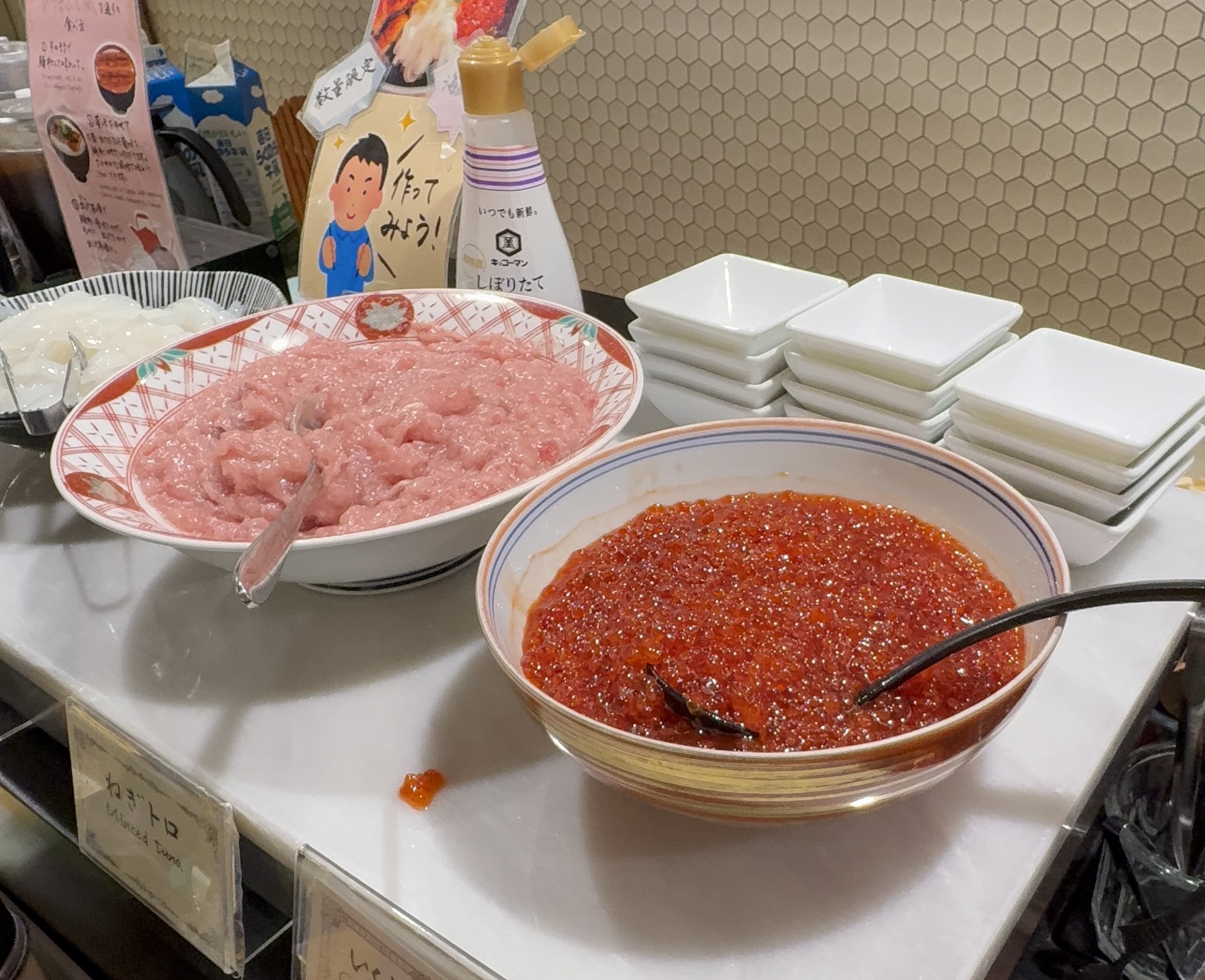 そして、鰻と人気の双璧を担っているのがイクラです。なくなってもどんどん追加される宝石箱です。鰻とイクラ以外の海鮮は日替わりだそうで、本日はネギトロとイカ。豪華海鮮丼が作り放題です。