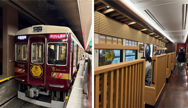 『ホテルグレイスリー京都三条』へは大阪からは阪急電車を使うのが便利だったので、今回はずっと乗りたかった「京都とれいん雅洛(がらく)」に乗って行くことに。雅洛は土日祝のみの特別仕様列車なんですが追加料金なし予約なしで特別感を味わえる仕様となっています。