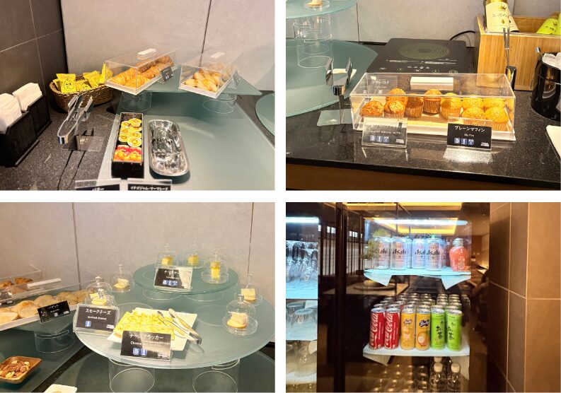 ラウンジ無料サービスコーヒー、紅茶、ソフトドリンク、アルコール、軽食、スイーツ