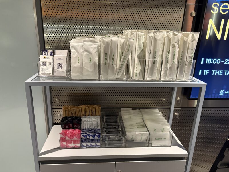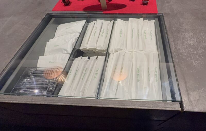 レセプション台にはアメニティコーナーがあり、歯ブラシセット、ヘアブラシ、カミソリ、綿棒を必要なものをピックアップします。