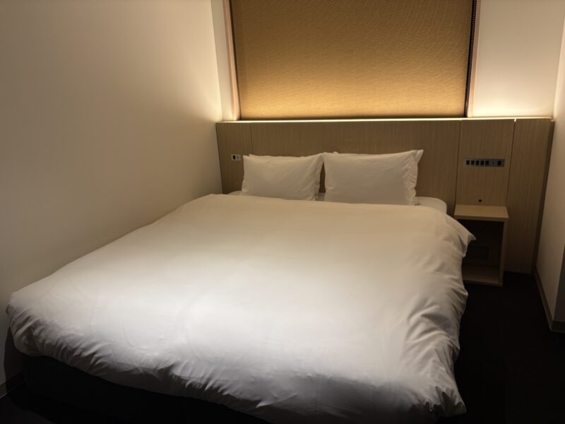 ベッド幅160cmで一般的なクイーンサイズ。ホテルってキングサイズのベッドが入っていいてもクイーンルームとかってサイズダウンしたルーム名が付くこと多いので、ホテル宿慣れしてる人だったら想像より小さめに感じる人もいるかも。