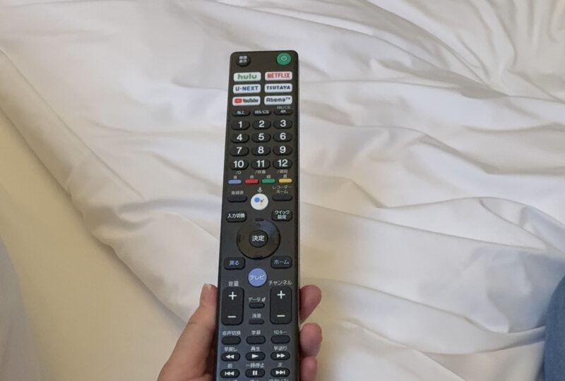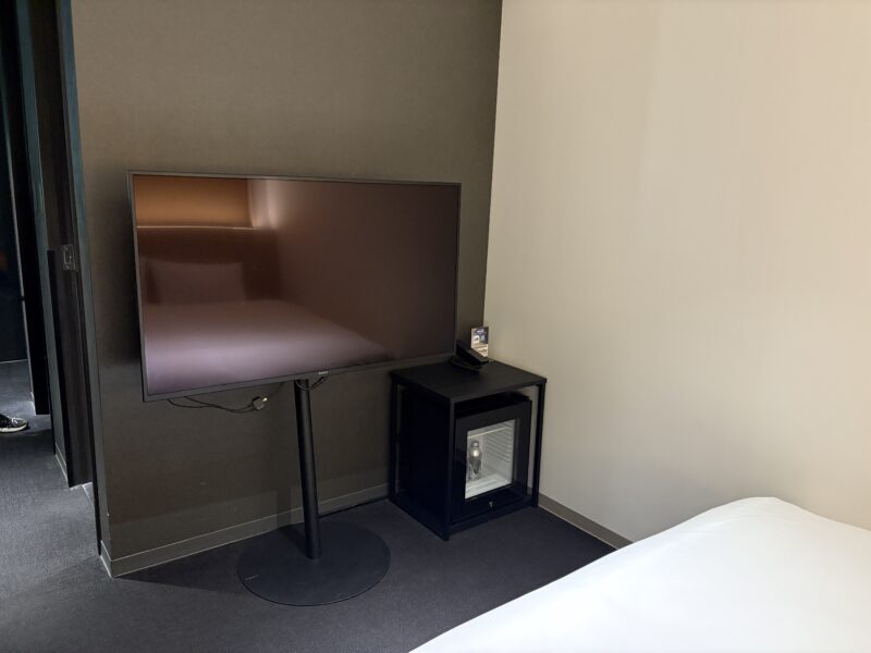 ベッドから見やすいベストポジションにあるテレビは49インチの大画面。壁付じゃないので背面のHDMIポートにもアクセスしやすく、大画面で旅のビデオチェックしたら盛り上がりそう。
