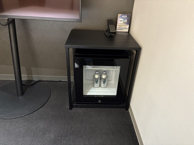 冷蔵庫はテレビ横。ドアがガラスになっていたおしゃれです。冷蔵庫の中にはミネラルウォーターが2本入っていました。水までオシャレ。