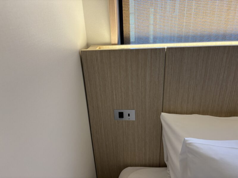 ベッドの両サイドにはAC電源のコンセントとUSBポートがあるのはありがたい。枕元でスマホを充電することができます。