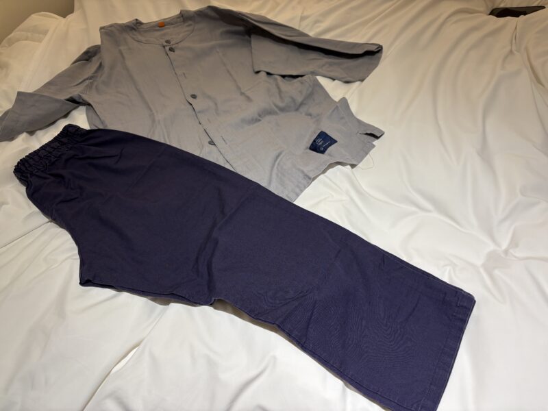部屋着はセパレートでズボンのウエストはゴム、上着はボタンの前開き。大浴場へは着用OK