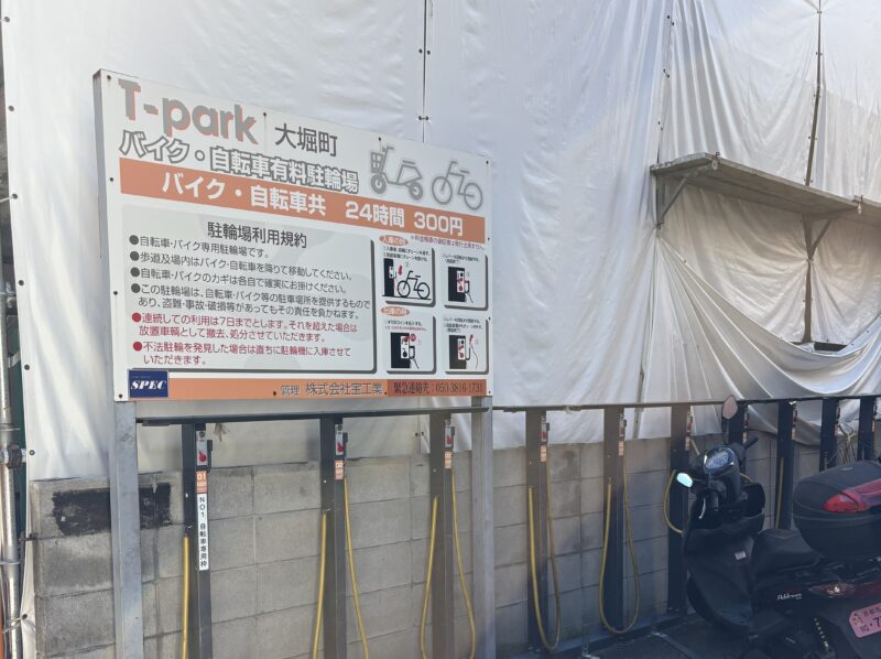 バイクって置くところに困ることがあって、ホテルからは10分以上も離れた場所に停めることもありますが『sequence KYOTO GOJO』の近くに良い駐車場を見つけました。ホテルから徒歩約2分、収容台数も多く24時間300円で停めれられる「T-park 大堀町」です。