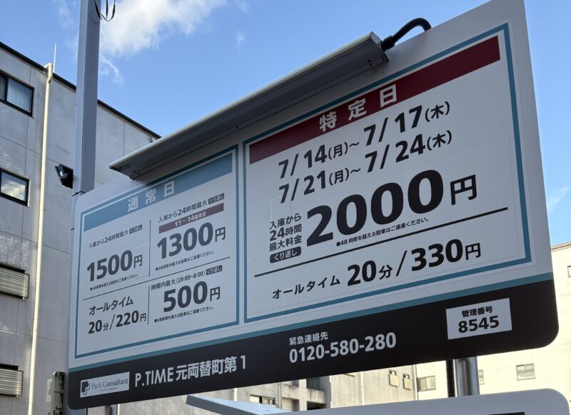 駐車場料金:24時間1,500円(11〜14番は1,300円)