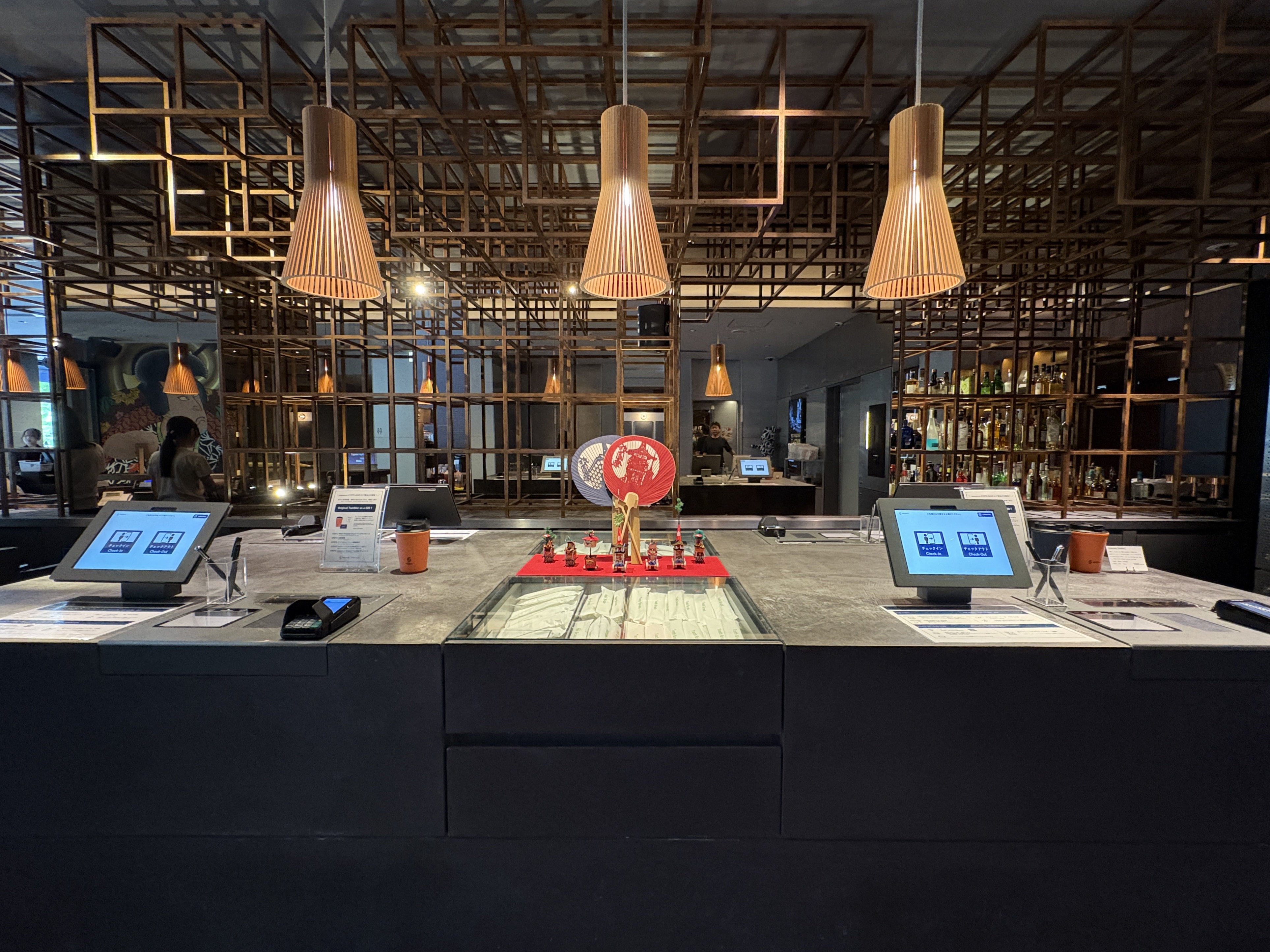 木のモニュメントとライトが印象的なフロント&エントランス。チェックインはタブレットで行います。